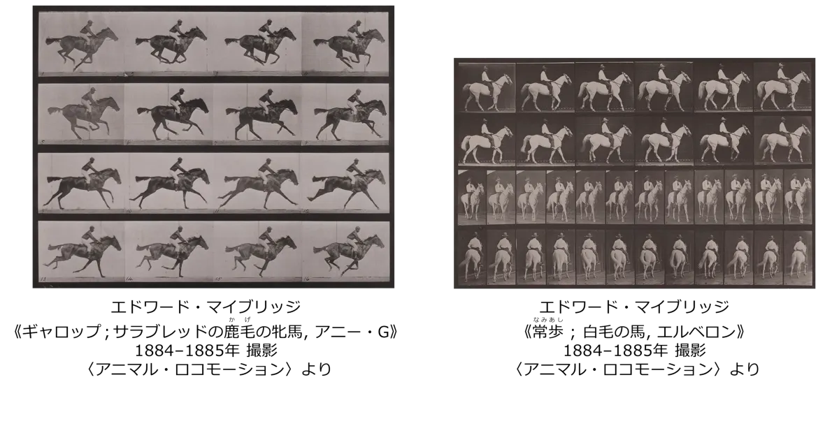 展示されるのは、エドワード・マイブリッジが1887年に発表した『アニマル・ロコモーション』の107組の連続写真の中から選ばれた、21組のフォトグラヴィア作品です。また、彼の写真が掲載された貴重な書籍『The Horse in Motion』や、同時代の生理学者エティエンヌ=ジュール・マレーの作品も併せて展示されます。