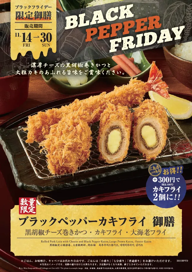 今回は、豪華な「ブラックペッパーカキフライ御膳」や家庭でも楽しめる「ブラックペッパーチーズ巻きかつ」が登場します。