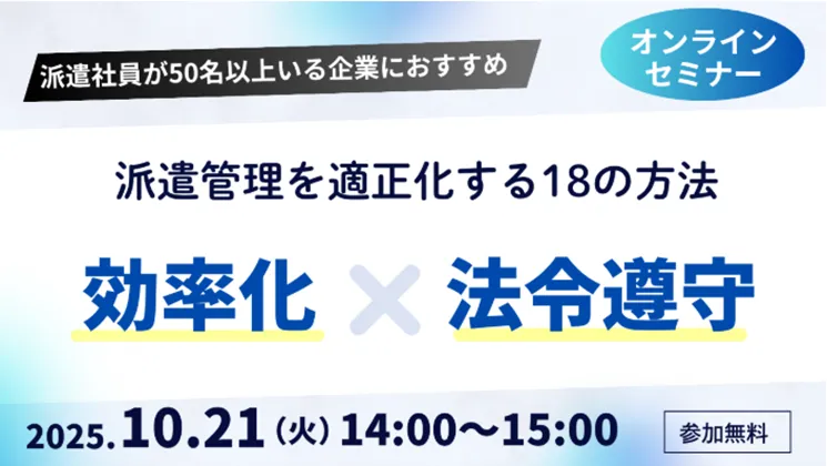 マンパワーグループ株式会社は、10月21日(火)に「派遣管理を適正化する18の方法」という無料オンラインセミナーを開催します。このセミナーでは、派遣社員を受け入れている企業の人事担当者や管理職を対象に、法律遵守と業務効率の両立に向けた実践的な手法が紹介されます。