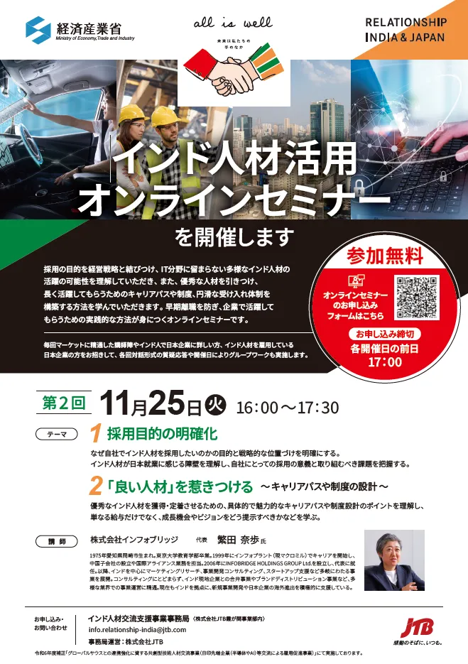 第4回目となるこのセミナーでは、特にインド人材を採用する際に直面する実務的な障壁について詳しく解説されます。具体的には、ビザや法務手続きの概要、さらには効果的な職務記述書の作成方法について触れます。また、日本人と異なるインド人材の選考ポイントや、スムーズな面接の進行方法についても紹介される予定です。