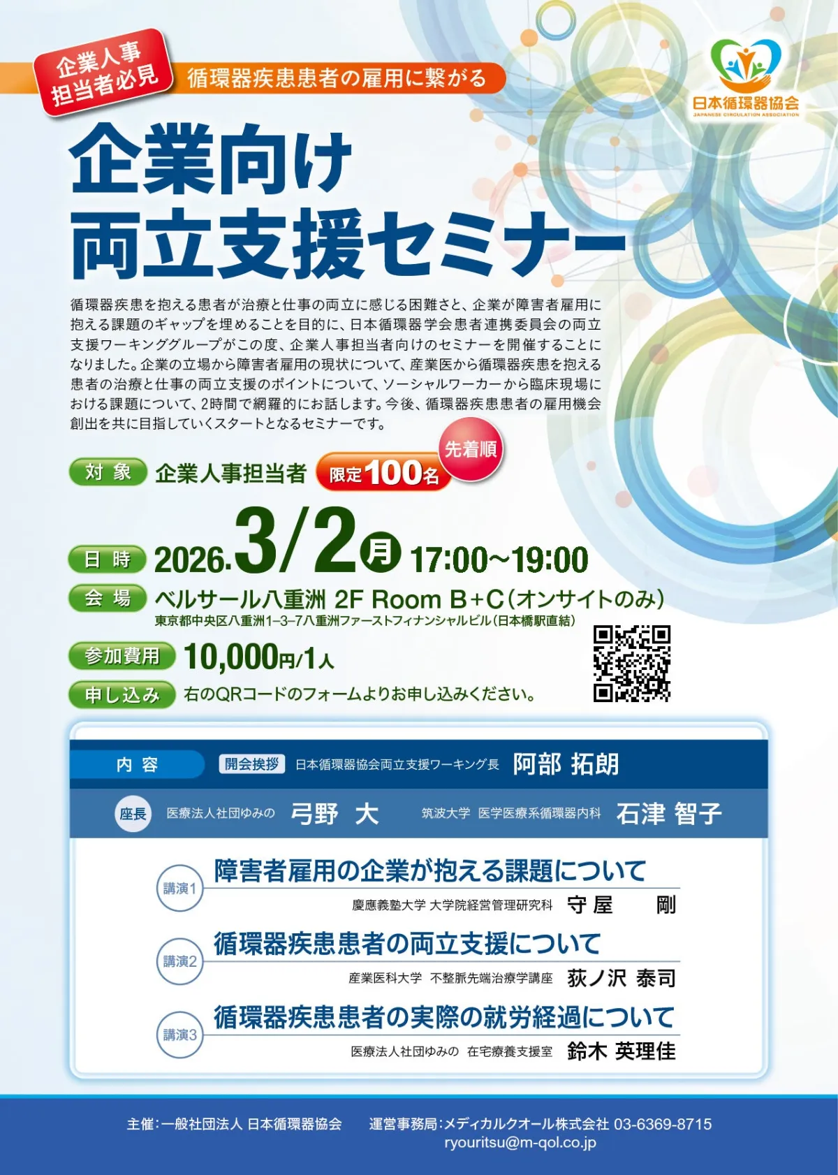 循環器疾患患者が自立した生活を送るためには、企業の理解と支援が不可欠です。このセミナーを通じて、障害者雇用に対する意識を高め、多くの患者が働きやすい環境を築くための第一歩を一緒に踏み出しましょう。お待ちしております。