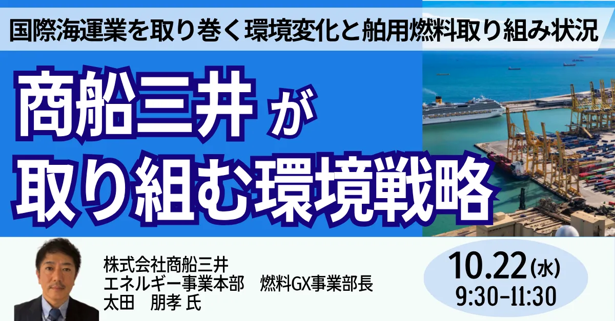 環境問題への取り組みが急務となっている今、業界を代表する企業、株式会社商船三井がどのようにその課題に立ち向かっているのかを知るチャンスがやってきました。10月22日(水)に、JPI(日本計画研究所)が主催するセミナーにて、商船三井エネルギー事業本部燃料GX事業部長の太田朋孝氏をお招きし、同社の環境戦略について詳しくお話ししていただきます。