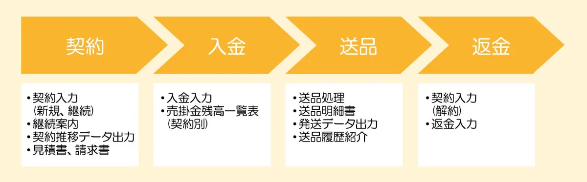 「定期契約管理」は、定期雑誌の購読管理だけでなく、さまざまな商材に幅広く対応が可能です。これにより、出版社のみならず、様々な業種の企業が同一の管理システム内でビジネスを展開できるようになります。