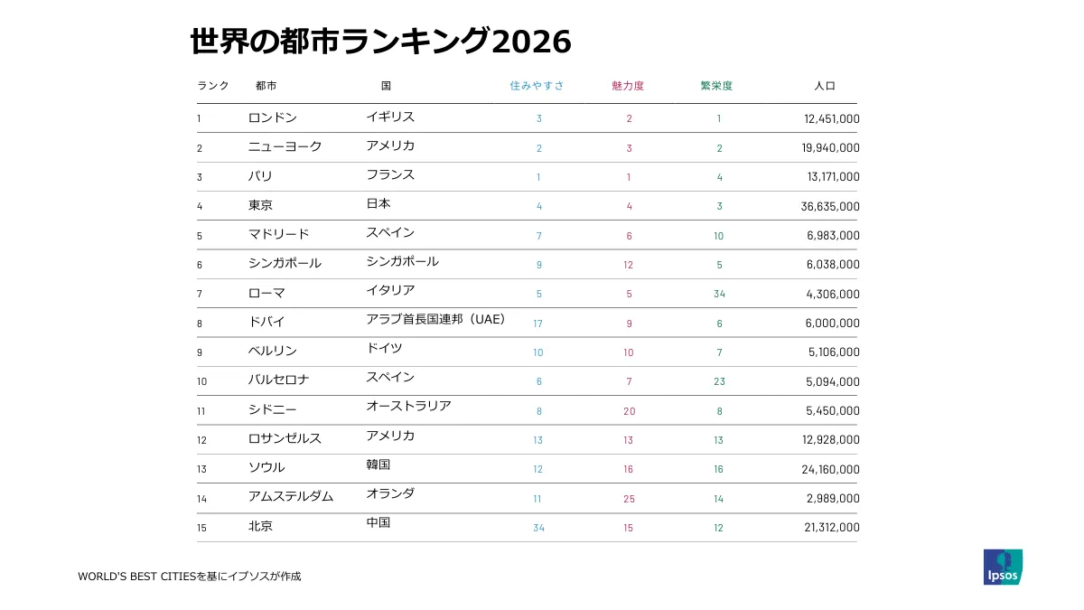 訪日観光の注目が高まり続けている日本。特に東京は、世界のベスト都市ランキングで見事に4位にランクインしました。この調査は、イプソス株式会社が実施した世界の都市の住みやすさ、魅力度、繁栄度を基にしたもので、東京は特に住みやすさと魅力度、繁栄度の面で非常に高い評価を得ています。